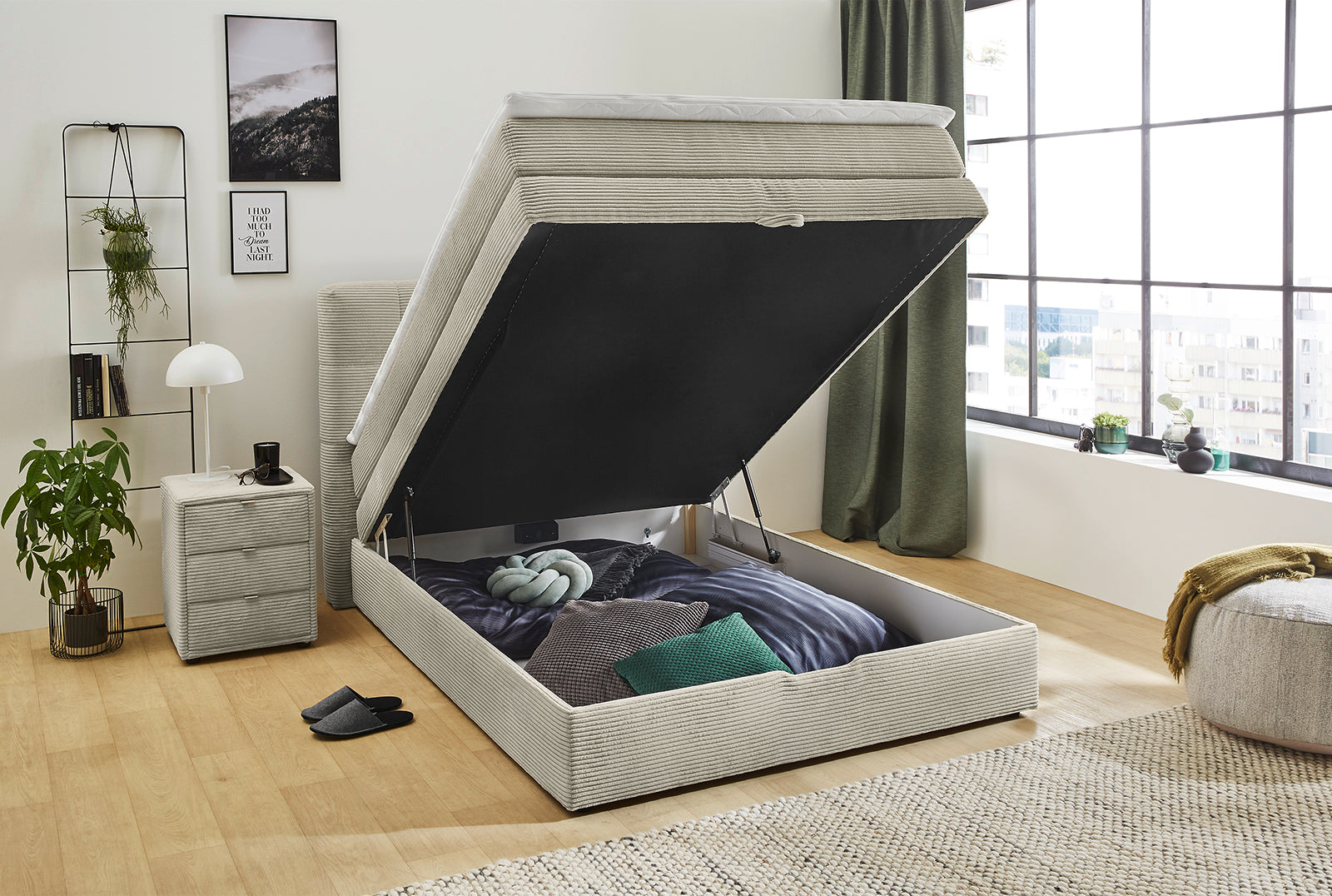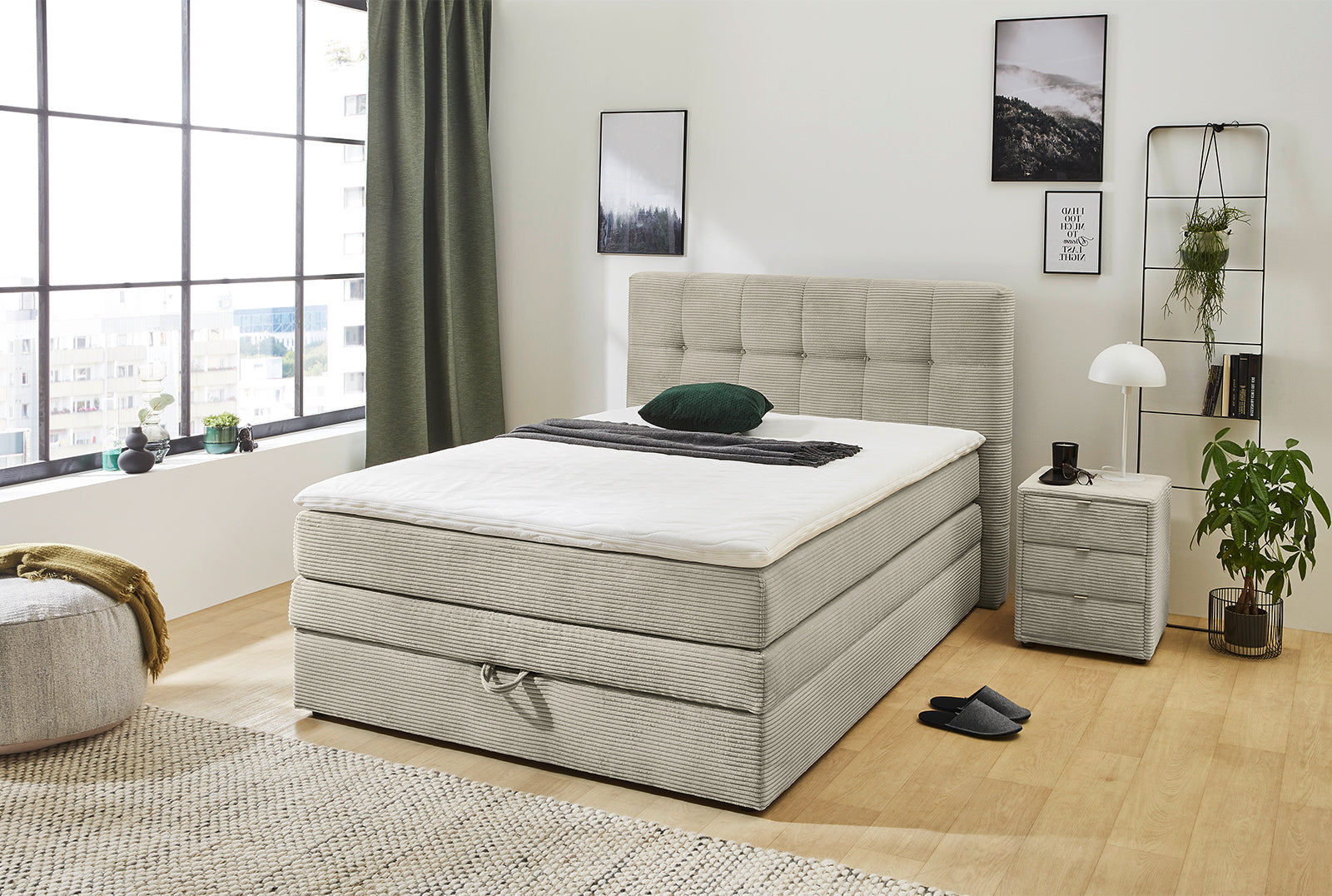 Ennek a boxspring rendszernek az alapját egy Bonell-rugós maggal párnázott box adja. Ebben a boxban alsó rugózásként egy Bonell-rugós mag szolgál. A boxon egy kiváló minőségű, 7 zónás, hordórugós (táskás) rugómagos matrac helyezkedik el. Az így létrejövő kettős rugózás egyedülálló rugózási komfortot biztosít, optimális testhez alkalmazkodással és nyomáscsökkentéssel. A nagyszerű alvásélményt a hideghab topper teszi teljessé. Ez a boxspring rendszer kiváló alváskomfortot nyújt az exkluzív és egyénre szabott kettős rugózási tulajdonságainak köszönhetően. A boxba integrált, szellőző ágyneműtartó gázrugós rásegítéssel nagyon könnyen nyitható, így jelentős tárolóhelyet kínál. A dús kialakítású fejtámla különleges megjelenést kölcsönöz az ágynak.