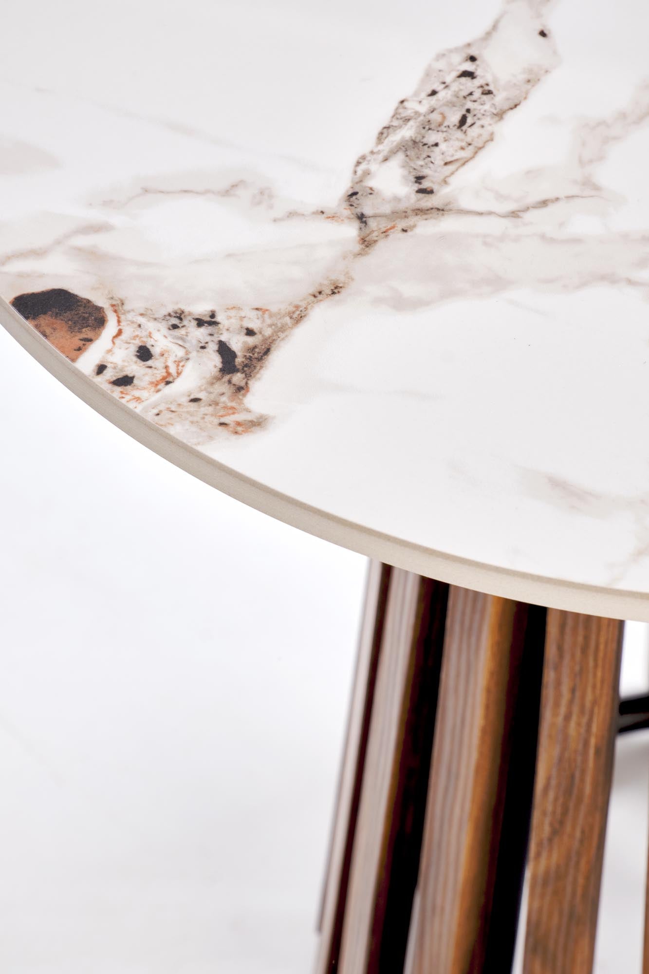 A Carlton dohányzóasztal igazi designékszer bármely enteriőrben. A különleges formatervezésű, lamellás fa hatású lábazat karakteres megjelenést kölcsönöz az asztalnak, míg a kör alakú, márványhatású asztallap luxus érzetet sugároz. Az asztal letisztult, mégis egyedi stílusa tökéletesen illik modern, glamour vagy akár art deco enteriőrökbe is. A Carlton nem csupán funkcionális bútordarab, hanem dekorációs elem is, amely önmagában is fókuszponttá válik a térben. A Carlton dohányzóasztal nemcsak praktikus, de esztétikai értékével is kiemelkedik – egy igazi designélmény, ami méltó középpontja lehet otthonodnak.