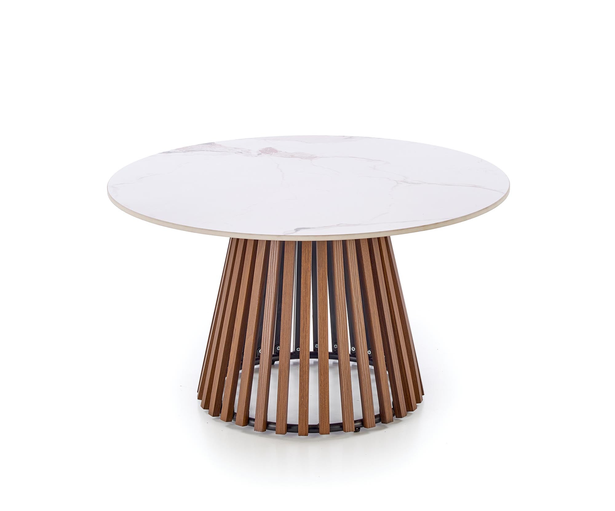 A Carlton dohányzóasztal igazi designékszer bármely enteriőrben. A különleges formatervezésű, lamellás fa hatású lábazat karakteres megjelenést kölcsönöz az asztalnak, míg a kör alakú, márványhatású asztallap luxus érzetet sugároz. Az asztal letisztult, mégis egyedi stílusa tökéletesen illik modern, glamour vagy akár art deco enteriőrökbe is. A Carlton nem csupán funkcionális bútordarab, hanem dekorációs elem is, amely önmagában is fókuszponttá válik a térben. A Carlton dohányzóasztal nemcsak praktikus, de esztétikai értékével is kiemelkedik – egy igazi designélmény, ami méltó középpontja lehet otthonodnak.