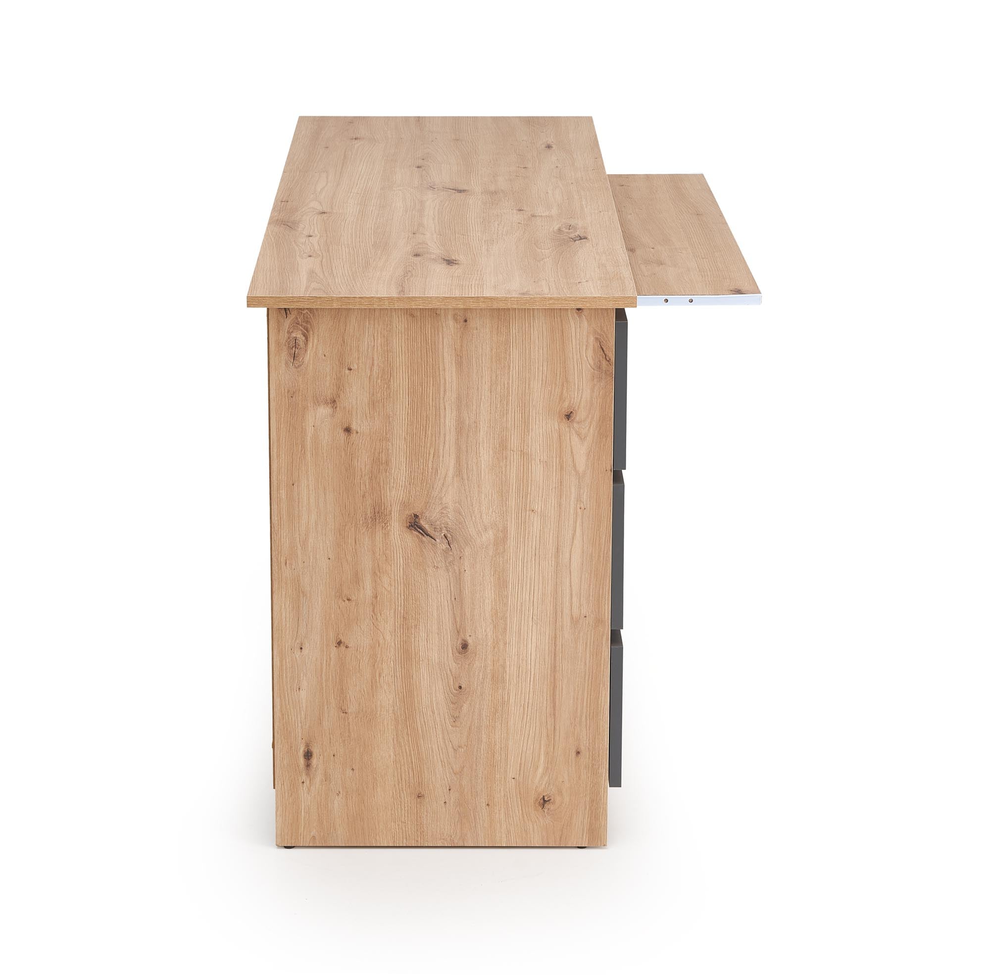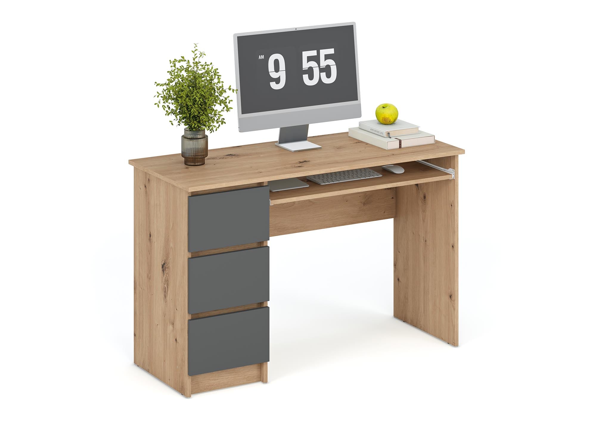 Az Elite íróasztal tökéletes választás, ha modern, letisztult stílusra és praktikus kialakításra vágysz. Artisan tölgy színével világosítja a teret, három fiókja pedig elegendő tárolóhelyet kínál az irodai eszközök számára. A kihúzható billentyűzettartó és a kompakt méret ideálissá teszi akár kisebb helyiségekbe is, legyen szó otthoni irodáról vagy tanulósarokról. Stílusosan illeszkedik egy minimalista, növényekkel és természetes anyagokkal díszített enteriőrbe, mint amilyet a képen is láthatunk.