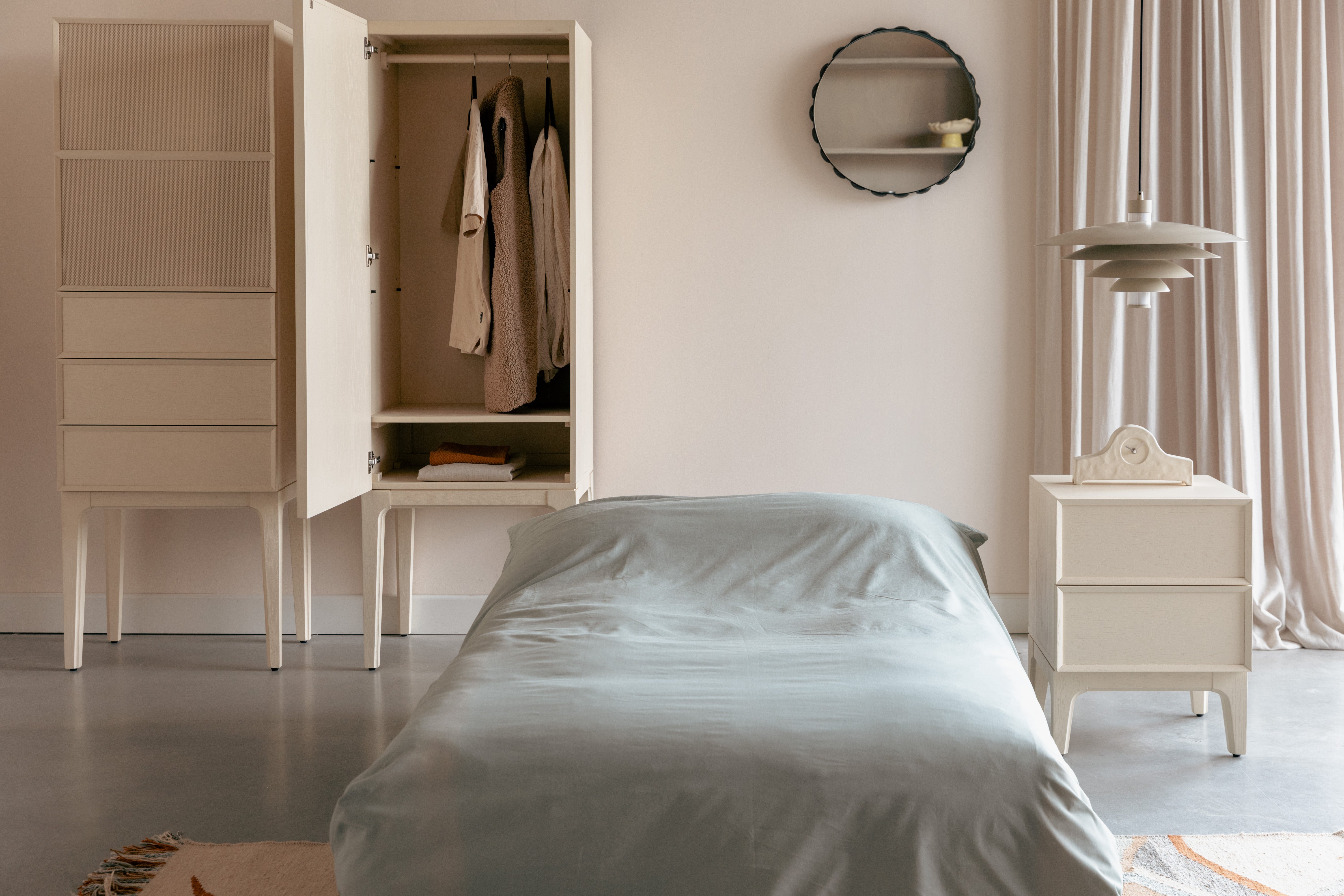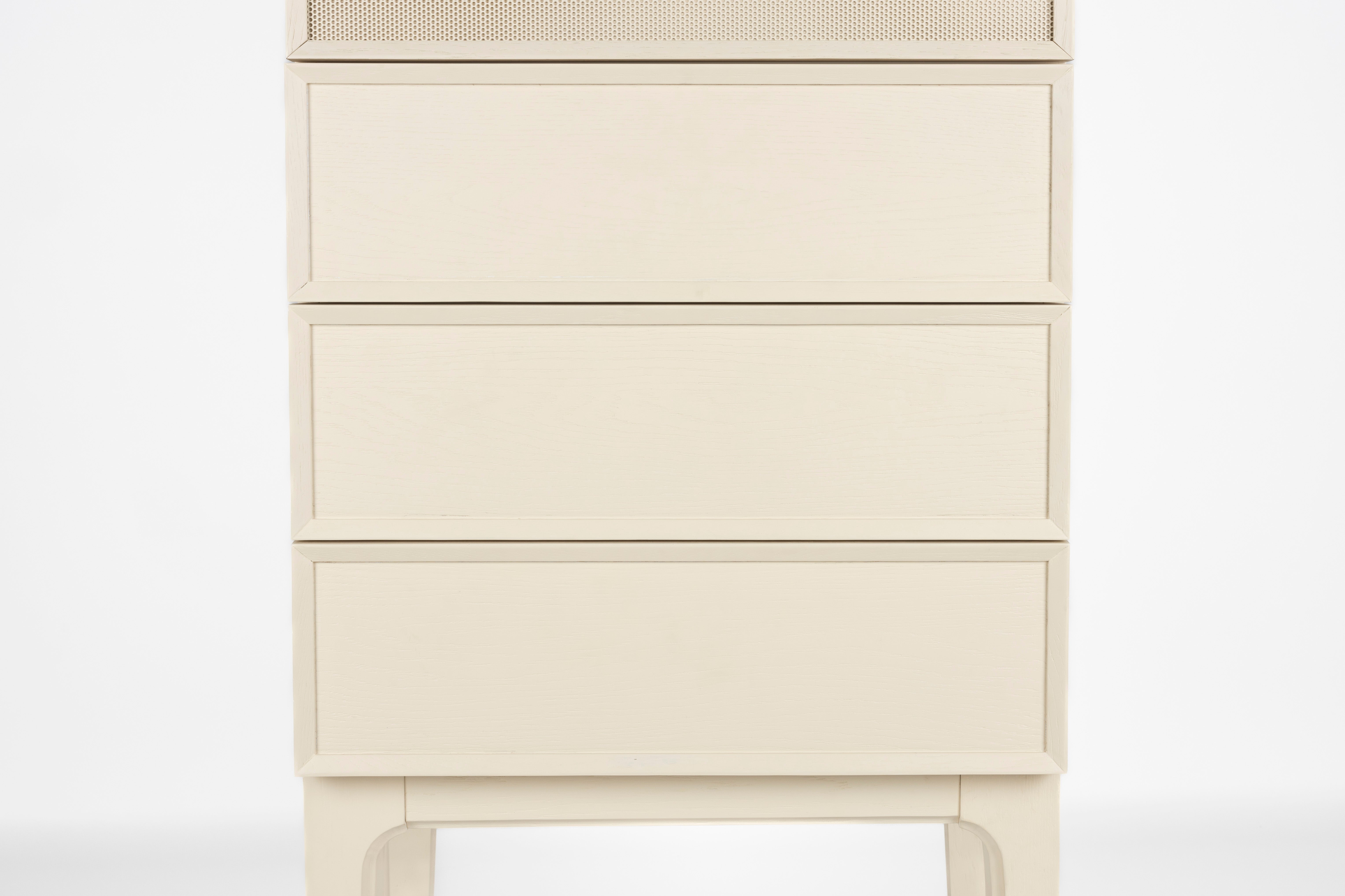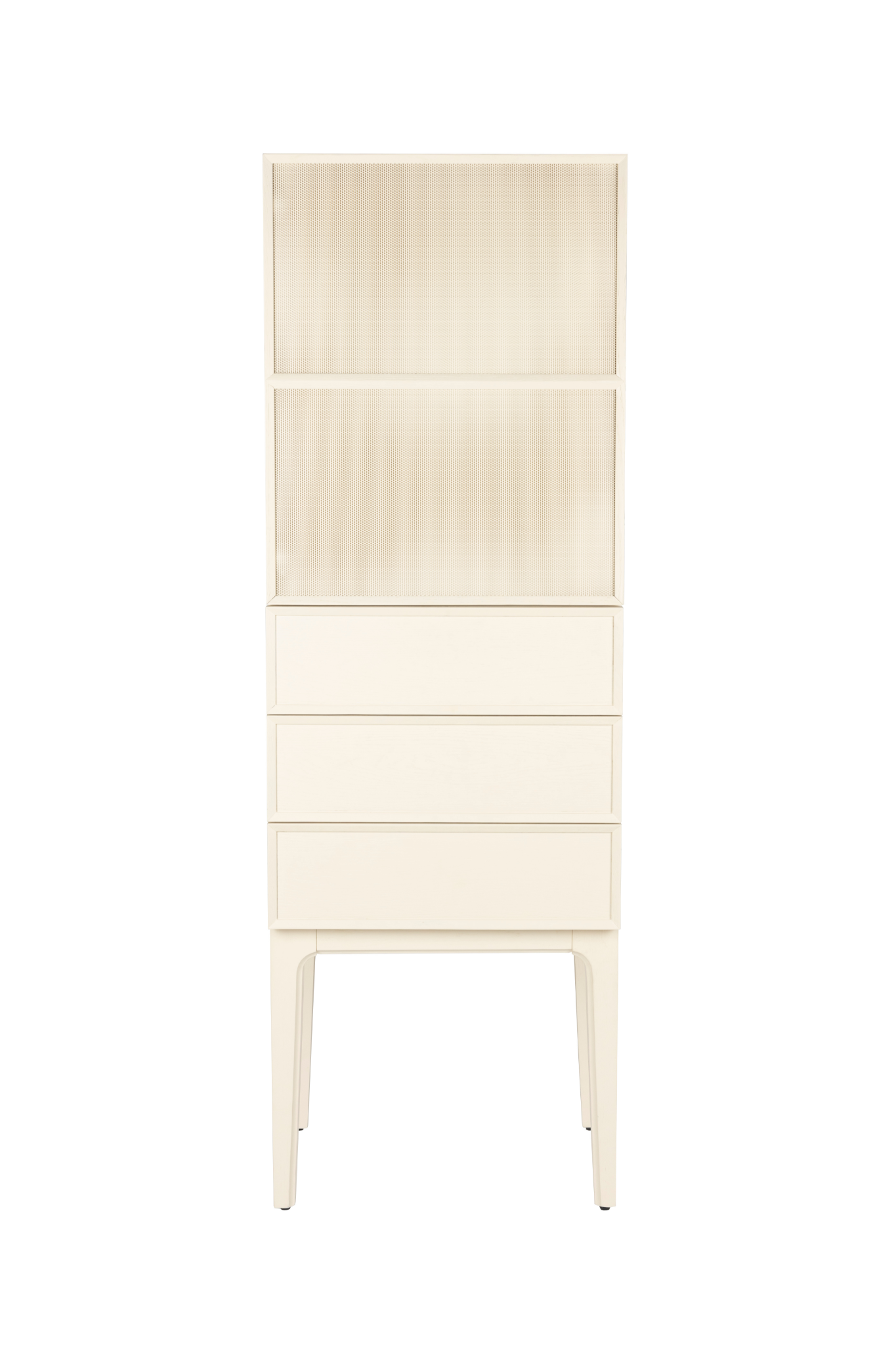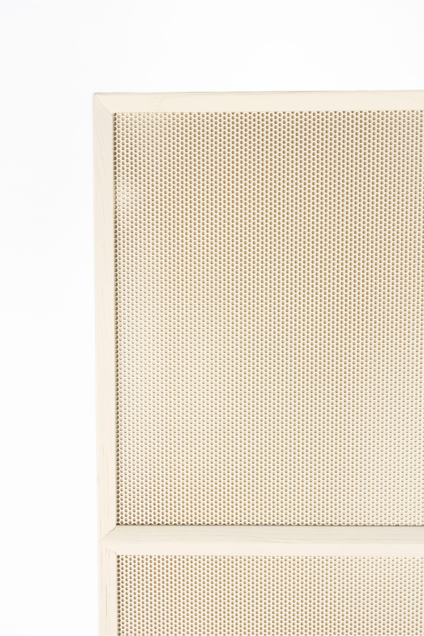 A June szekrény a modern formavilág és a klasszikus anyaghasználat tökéletes ötvözete. Az ajtókat díszítő látványos fémrács-panel és a tölgyfa természetes erezete különleges kontrasztot alkot, amelyet a Pantone színben megálmodott felület még inkább kiemel. A tágas rekeszek bőséges helyet kínálnak minden szükséges tárgynak, miközben a magasított lábak könnyedséget és légies megjelenést biztosítanak. Így a June nem csupán tárolóbútor, hanem karakteres design-darab, amely feldobja otthonod hangulatát.