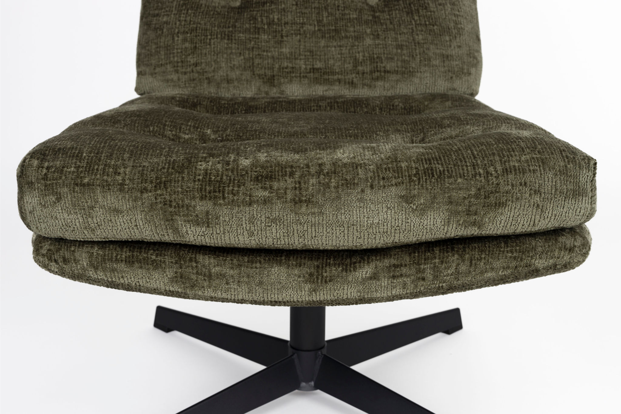 A Kai fotel azonnal magára vonja a figyelmet különleges, mélyzöld kárpitjával és karakteres, gombos steppelt kialakításával. Ez a darab egyszerre idézi meg a vintage lounge hangulatot és kínálja a modern komfortot, amelyre a mindennapokban vágyunk. A puha, vastagon párnázott ülőfelület és háttámla garantálja a kényelmes pihenést, míg a stabil, fekete fém csillagláb légies könnyedséget és biztos tartást nyújt. A Kai fotel ideális választás olvasósarokba, nappaliba vagy akár irodába, ahol egyszerre lehet design központi eleme és a nyugodt pillanatok társa. Ez a fotel nem csupán ülőhely – hanem egy stílusos időutazás a retró és a kortárs világ között.