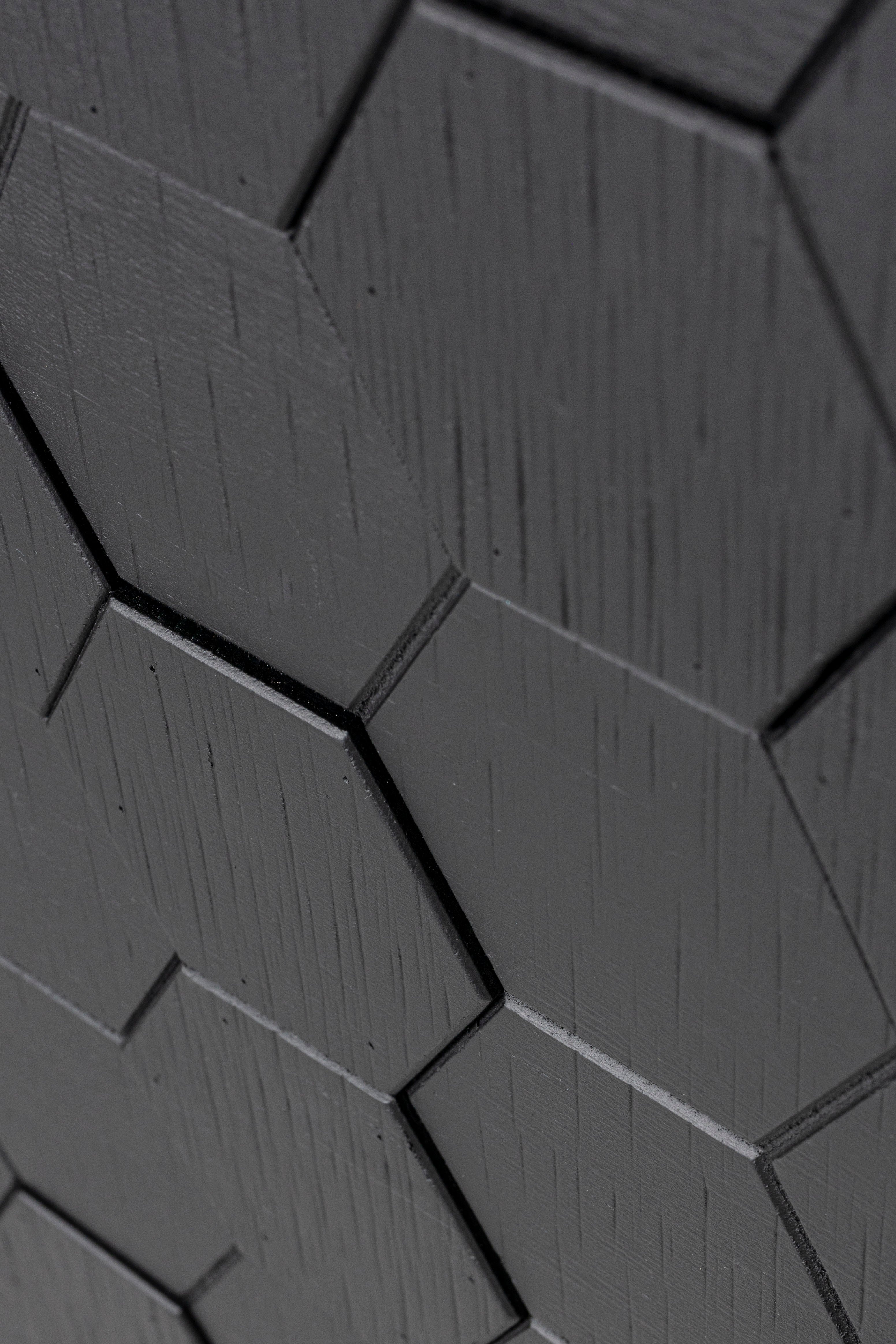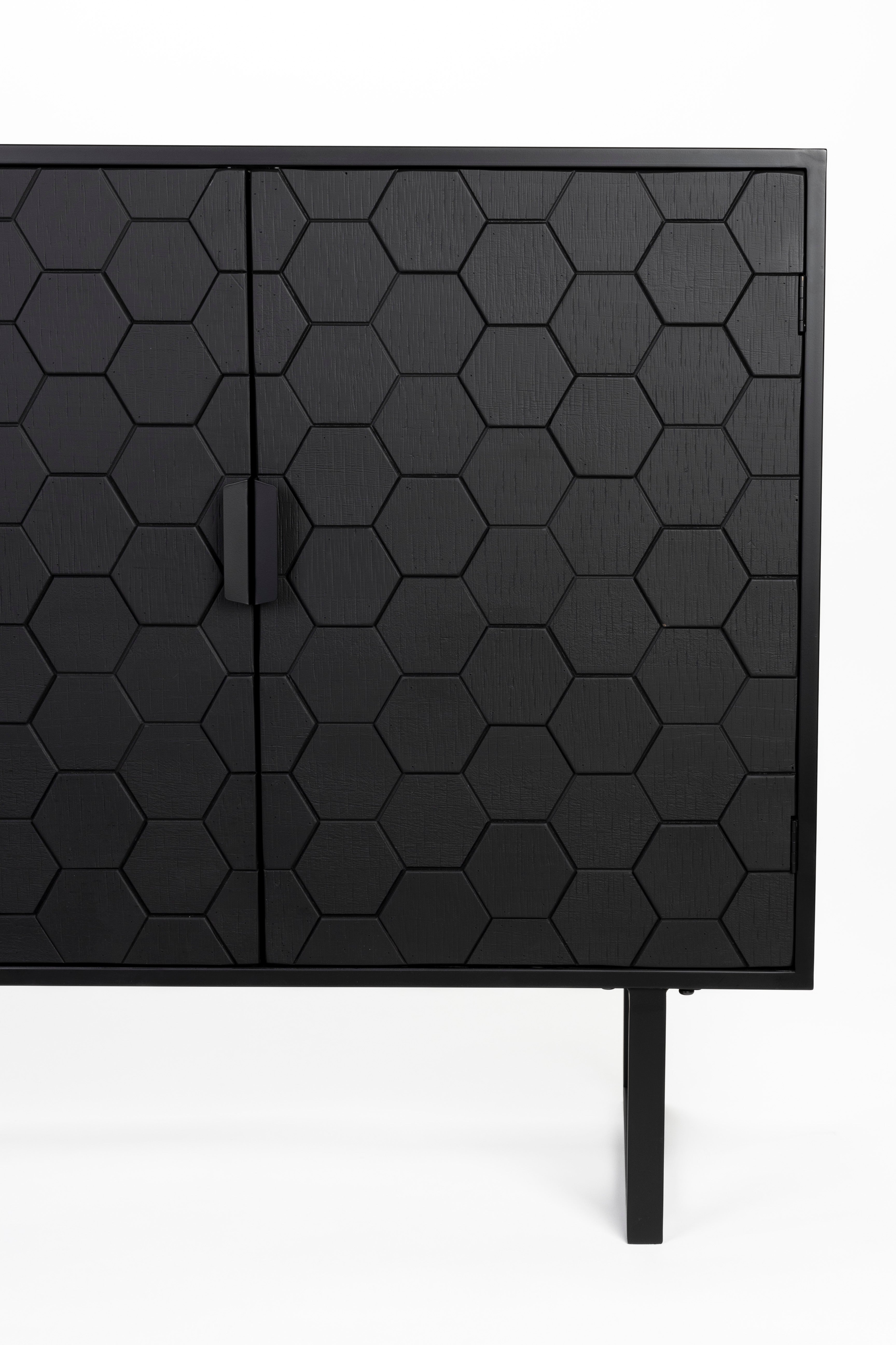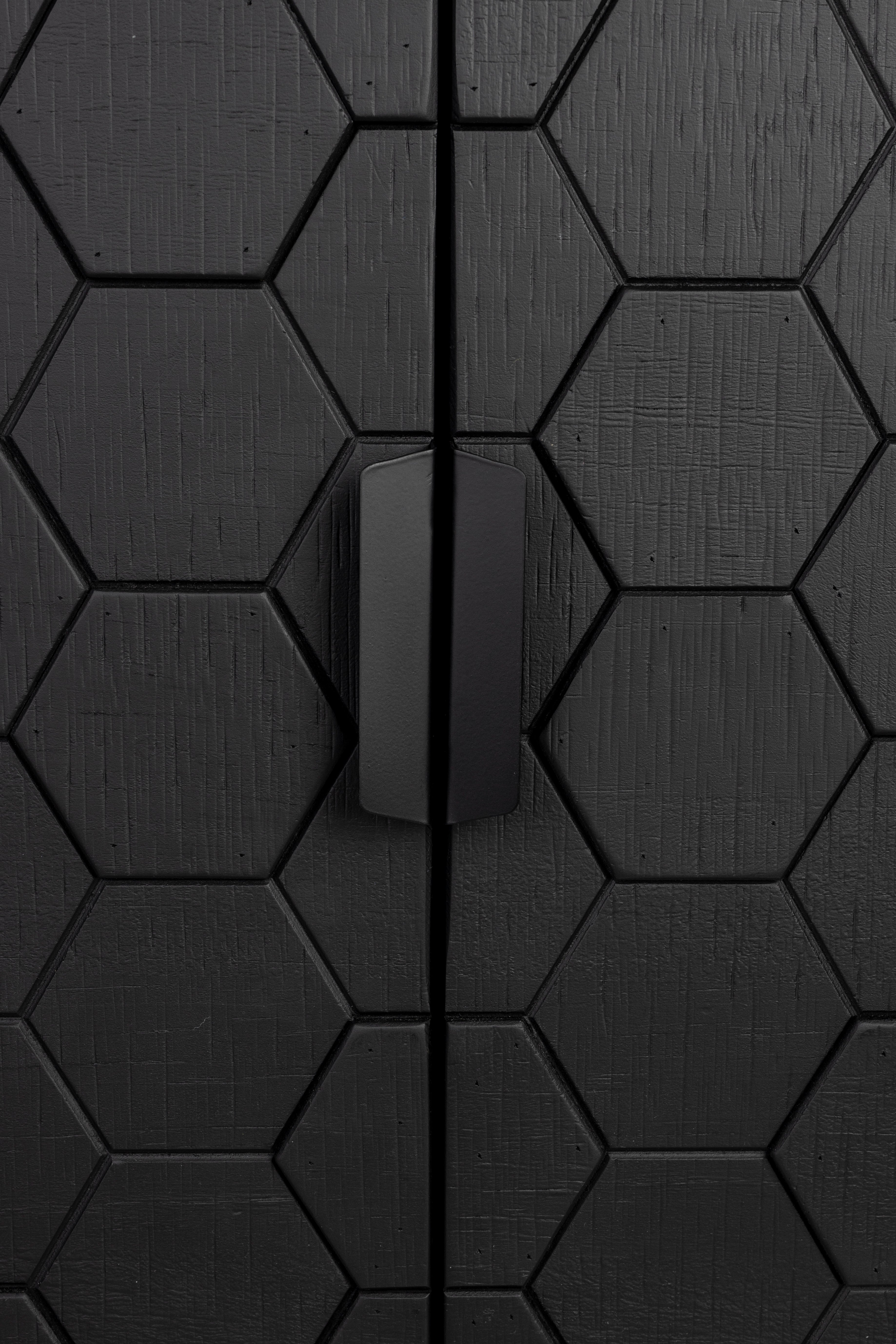 A Linc első pillantásra magára vonja a figyelmet különleges, hatszög mintázatú ajtófrontjaival. Ez az aprólékosan kidolgozott felület elegáns játékosságot visz a bútor megjelenésébe, miközben a teljesen fekete színvilág modern, erőteljes kisugárzást kölcsönöz. A Linc egyszerre trendi és időtálló, tökéletes választás mindazok számára, akik egyedi, karakteres darabot keresnek otthonukba. A három tágas ajtó mögött bőséges tárolóhely rejlik, így minden könnyen rendszerezhető és elérhető marad. A masszív fémlábak biztosítják a stabilitást, miközben légies hatást keltenek, így a komód nem nehezíti el a teret. Akár a nappaliba, étkezőbe vagy előszobába helyezed, a Linc mindig letisztult eleganciát sugároz.