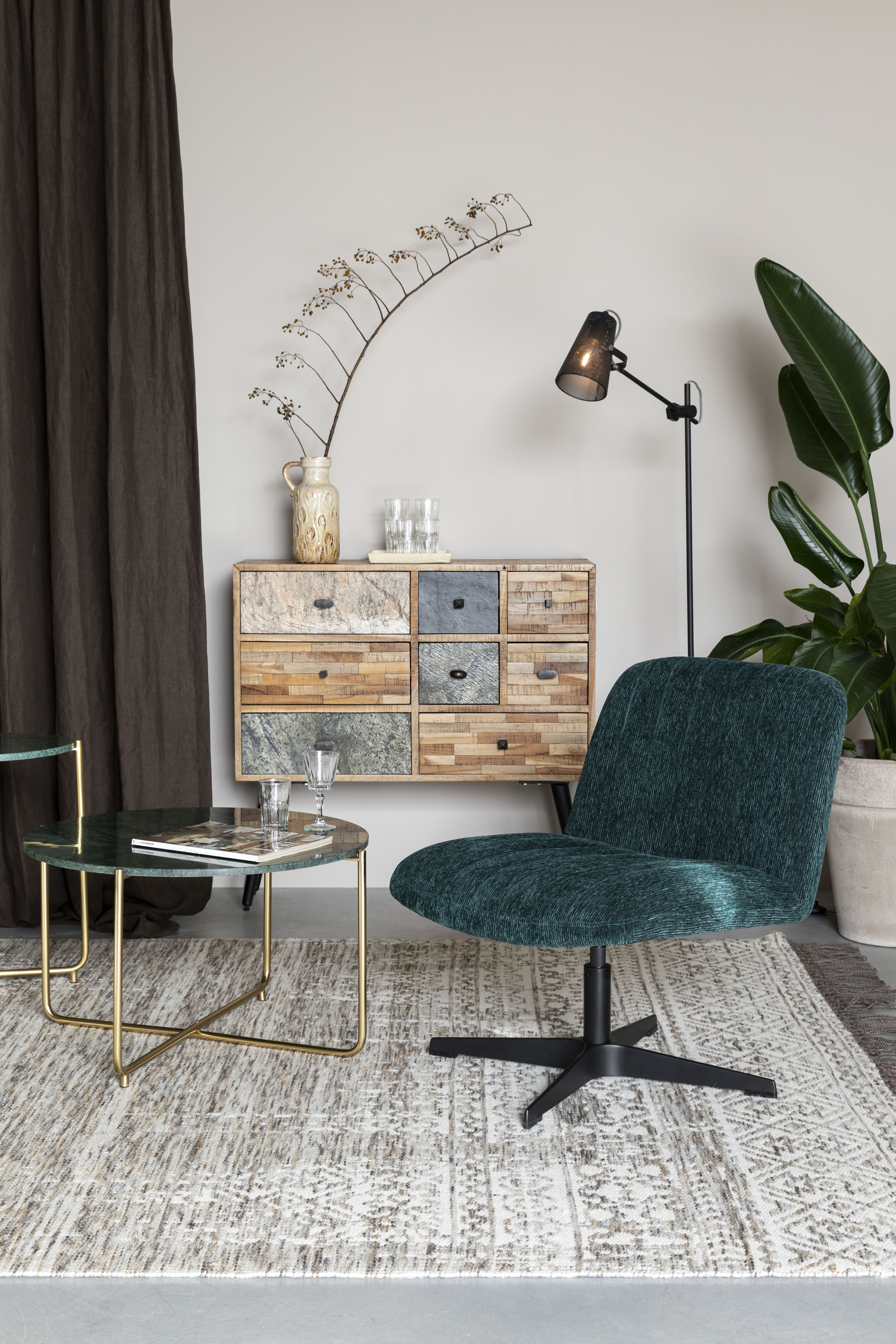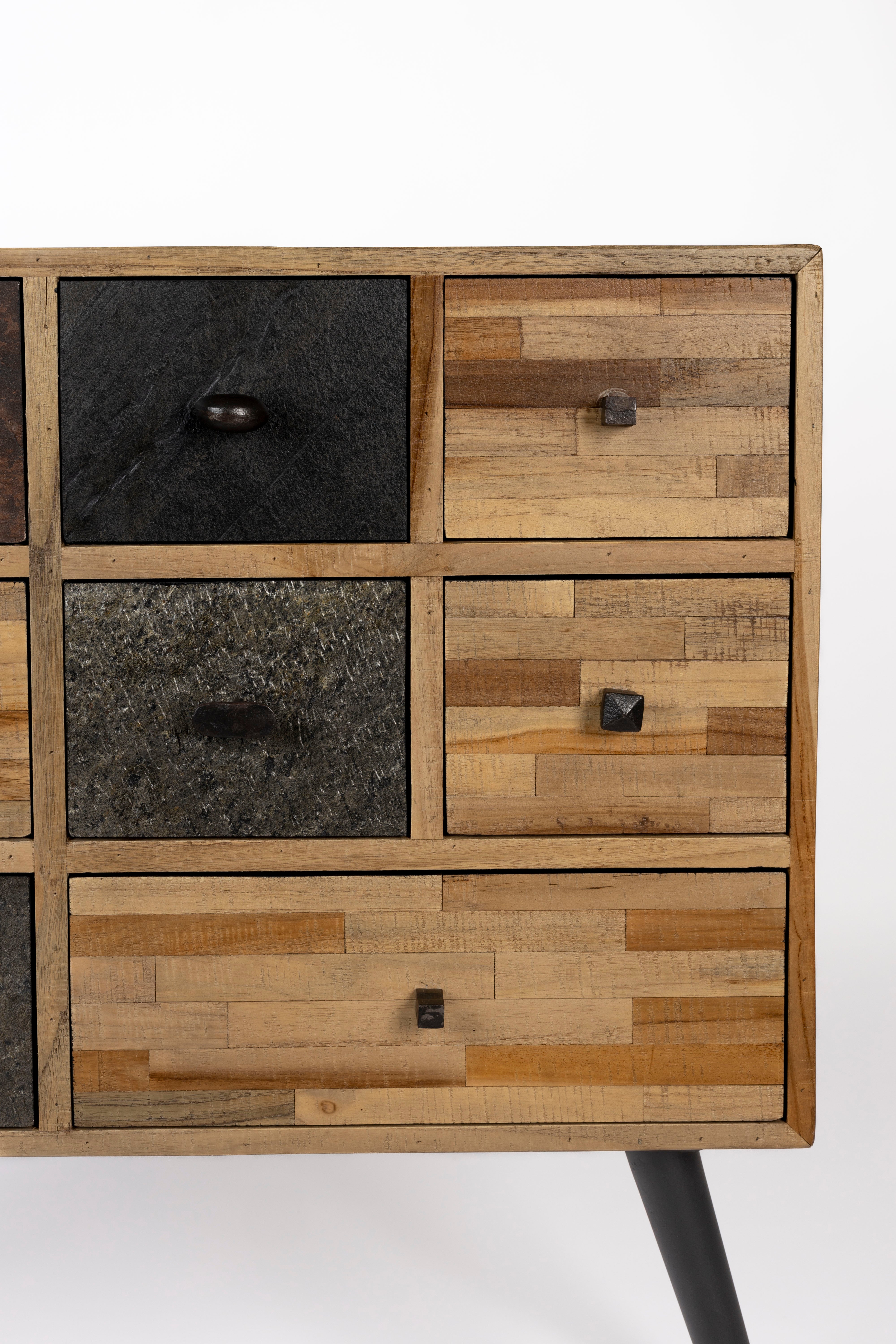 A San komód olyan, mintha egy kézműves műhelyből érkezett volna közvetlenül az otthonodba. A különböző anyagokból és textúrákból készült fiókelőlapok izgalmas patchwork-hatást keltenek, amely mindig új részleteket tár fel. A meleg tónusú fa természetes szépsége és a sötétebb árnyalatok kontrasztja igazán egyedivé teszik a bútordarabot. A San nemcsak látványos, hanem rendkívül praktikus is: a nyolc különböző méretű fiók bőséges helyet kínál a mindennapi tárgyak, dokumentumok vagy kisebb kincsek rendszerezett tárolására. A fekete, enyhén kifelé dőlő lábak modern lendületet adnak, miközben stabil alapot biztosítanak.