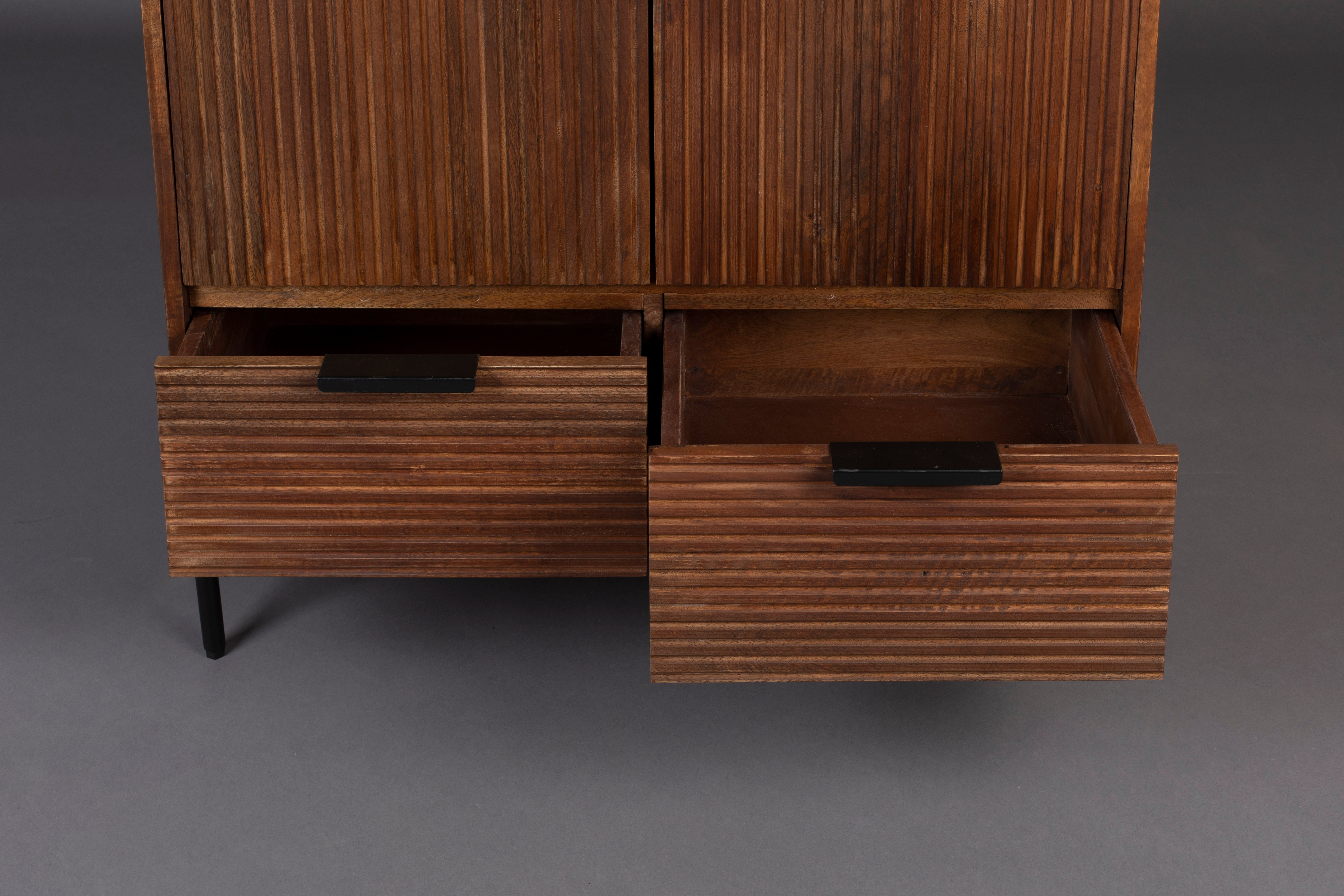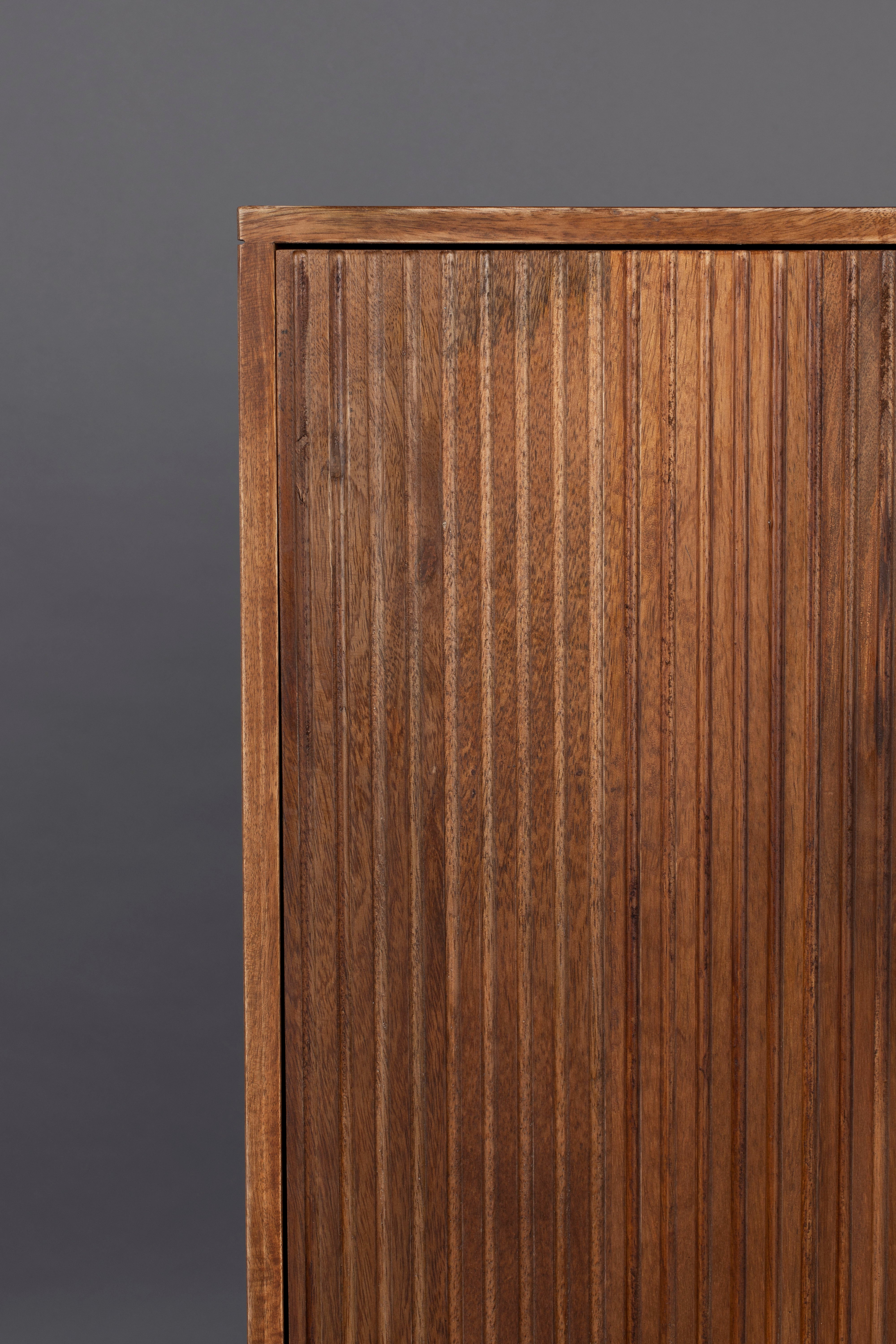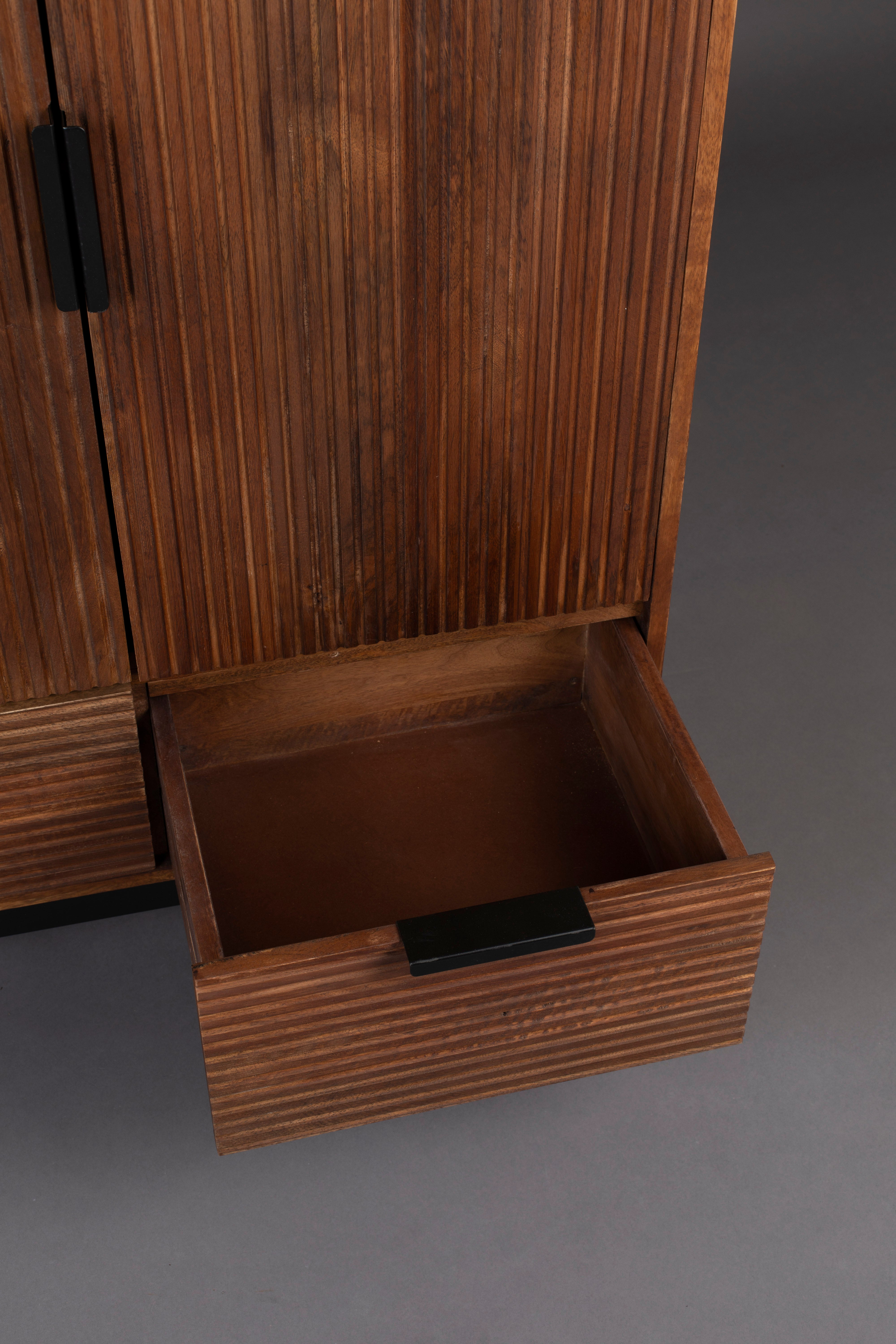 A Saroo magaskomód a múlt időtlen báját és a jelen trendjeit ötvözi egy különleges bútordarabban. A tömör mangófából készült felületeket finoman mart grafikus minták díszítik, amelyek azonnal egyedi karaktert kölcsönöznek a komódnak, és visszafogott vintage hangulatot árasztanak. A kontrasztot a matt fekete részletek teremtik meg – a porszórt acél lábak és fogantyúk modern hatást adnak, így a Saroo bármelyik korszerű enteriőrben is otthonra talál. A komód ráadásul nemcsak látványos, hanem rendkívül praktikus is: tágas belső tere könnyedén elnyeli a mindennapi tárgyakat, miközben a nappaliban, étkezőben vagy hálószobában is meleg, hívogató légkört teremt.