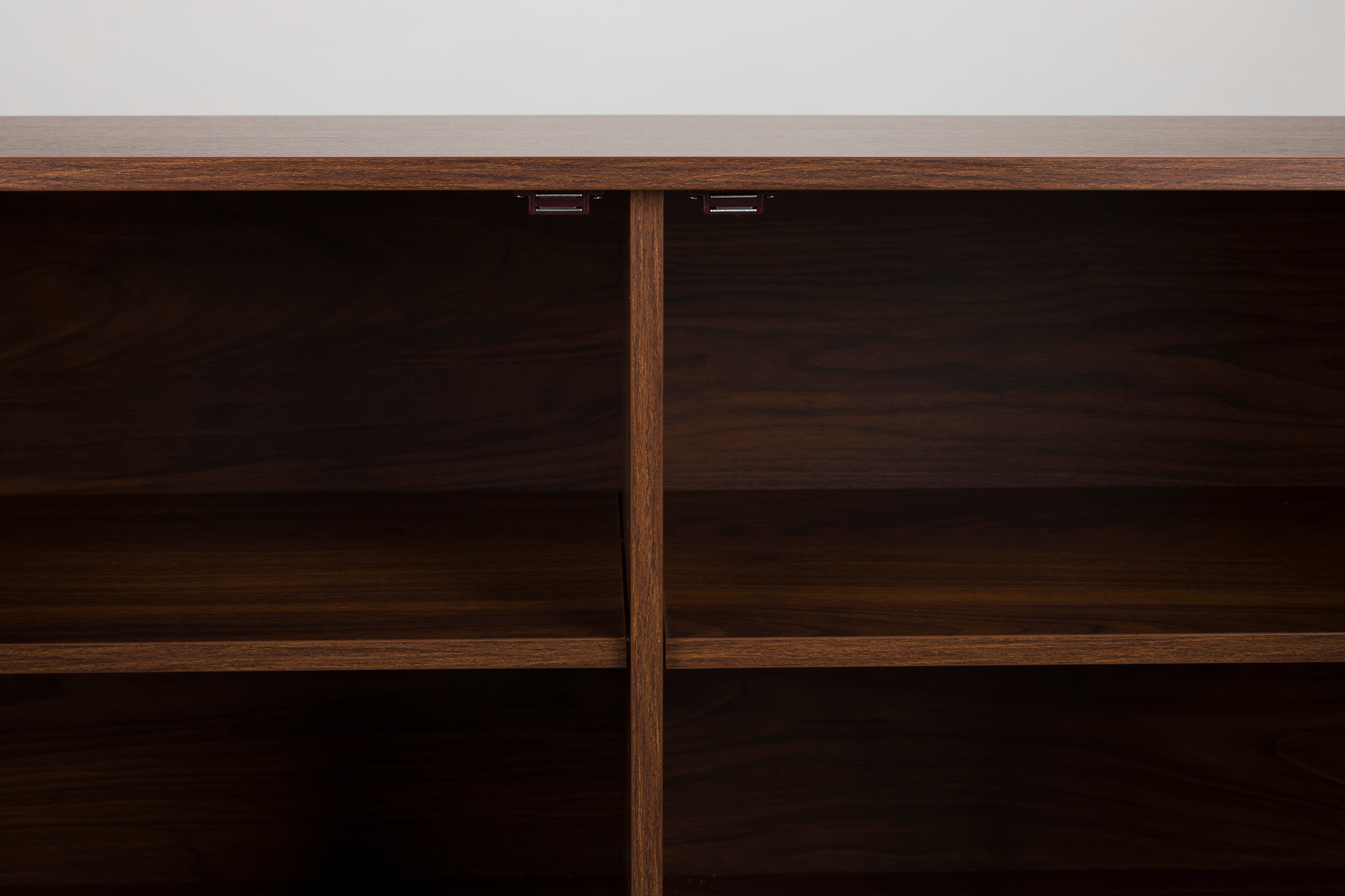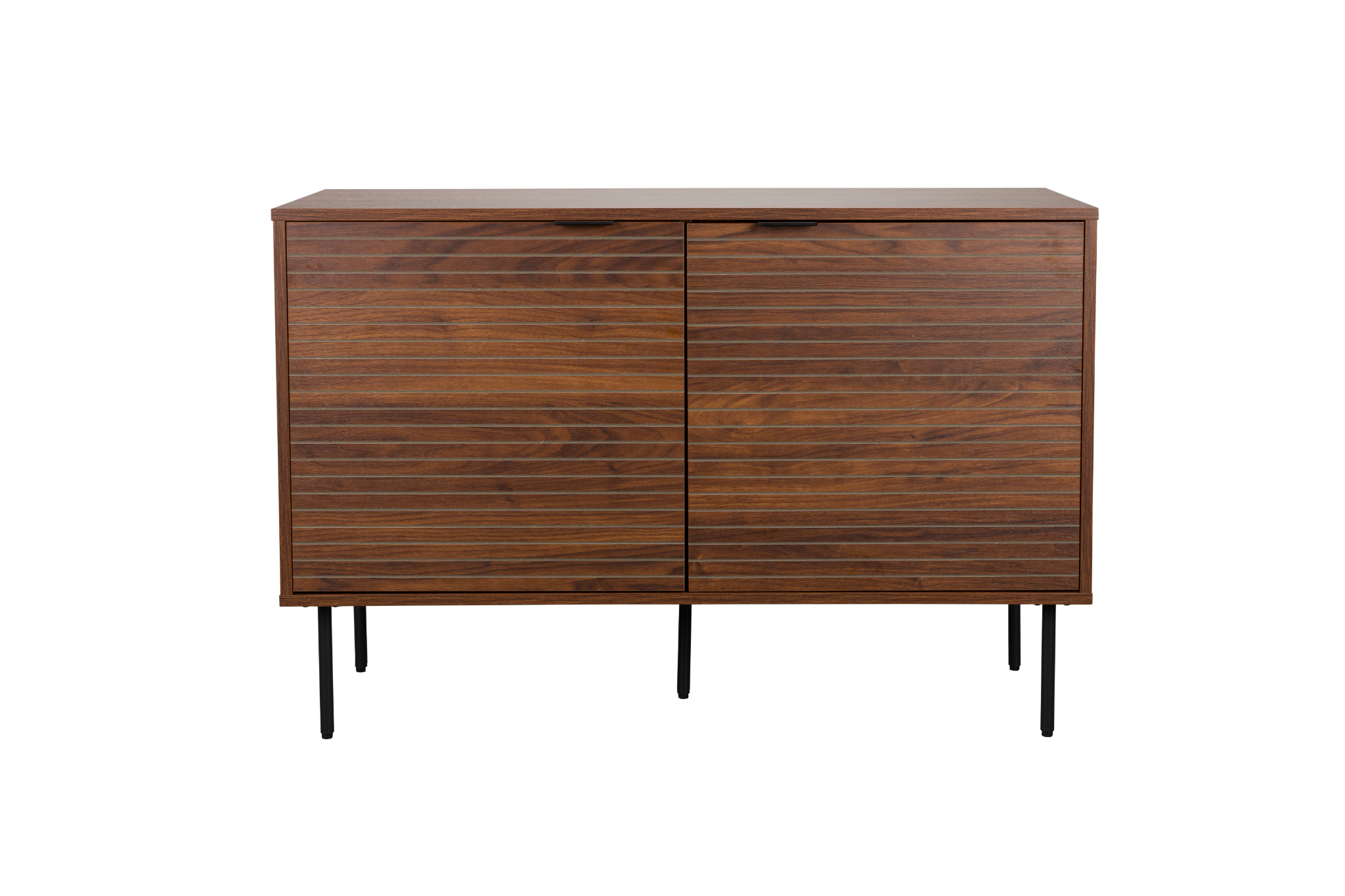 A Stripes komód első látásra a fa természetes szépségével ragadja meg a figyelmet. A vízszintesen futó, finoman mart vonalak elegáns ritmust adnak a felületnek, amely egyszerre modern és időtálló. A meleg diószínű árnyalat otthonos, barátságos hangulatot teremt, miközben a karcsú fekete fém lábak légies könnyedséget kölcsönöznek a bútornak. A két tágas ajtó mögött bőséges tárolóhely rejlik, amely lehetővé teszi, hogy minden szükséges holmi rendezett módon elférjen. Akár nappaliba, étkezőbe vagy dolgozószobába helyezed, a Stripes komód minden enteriőrben harmonikus, kifinomult jelenlétet biztosít.