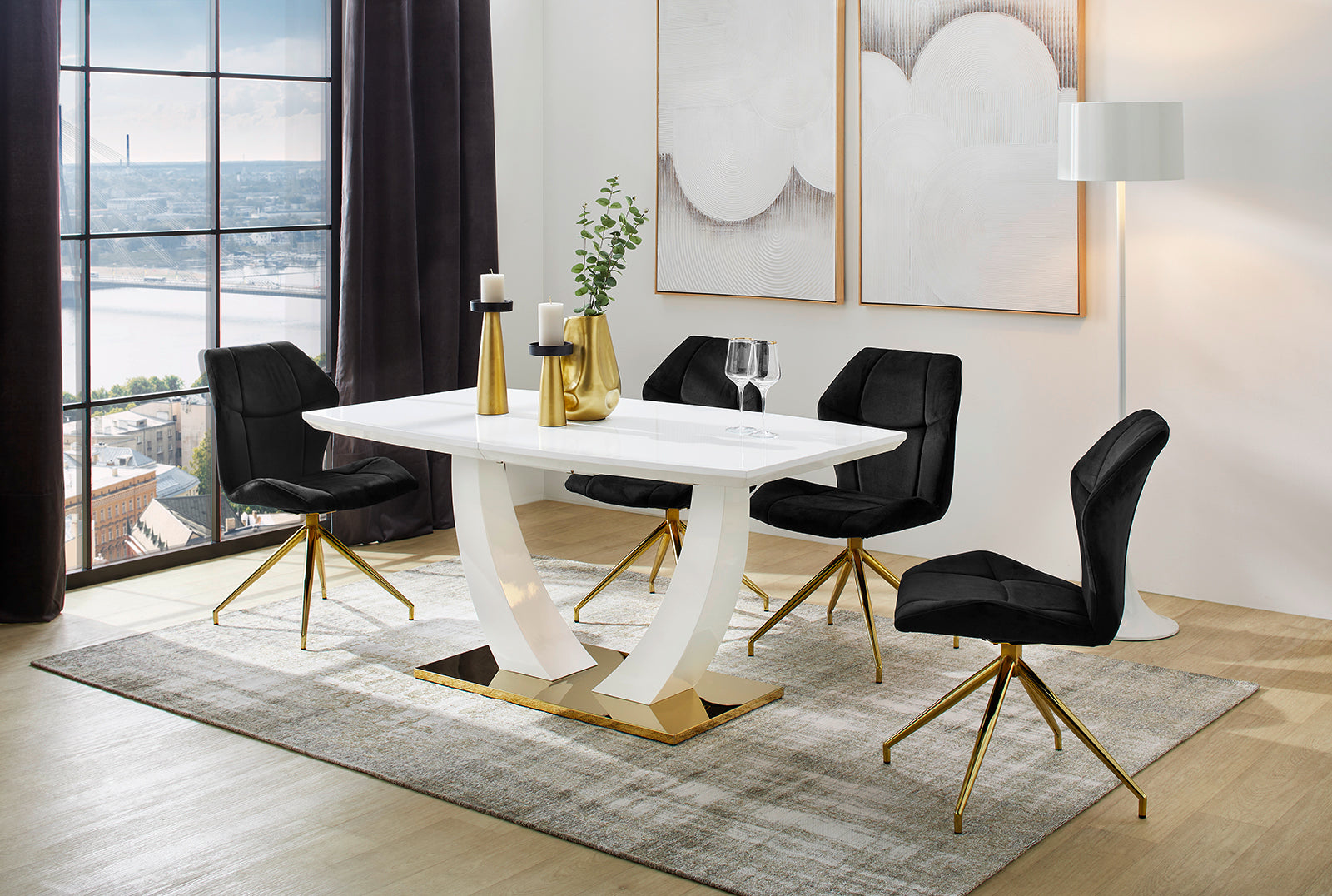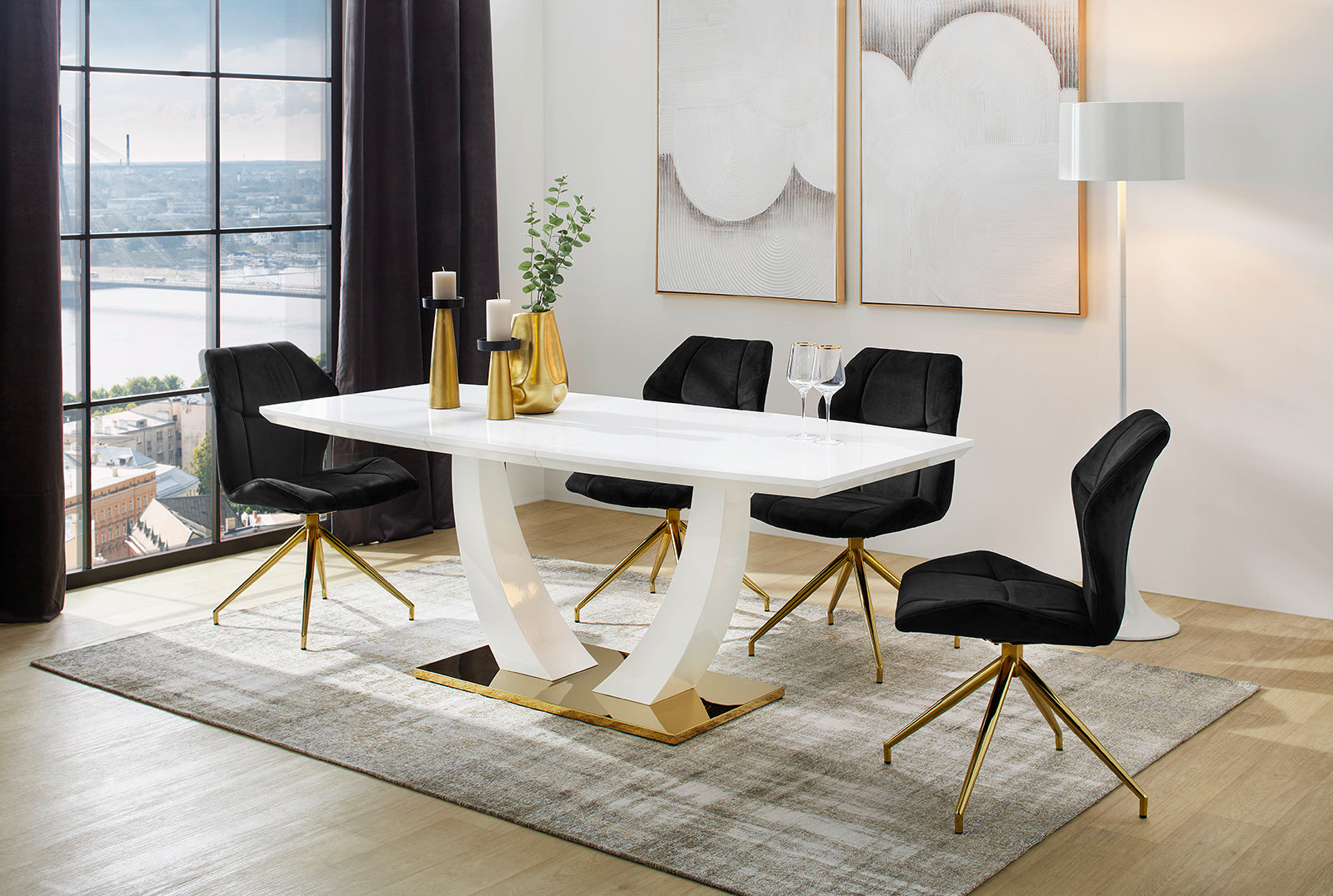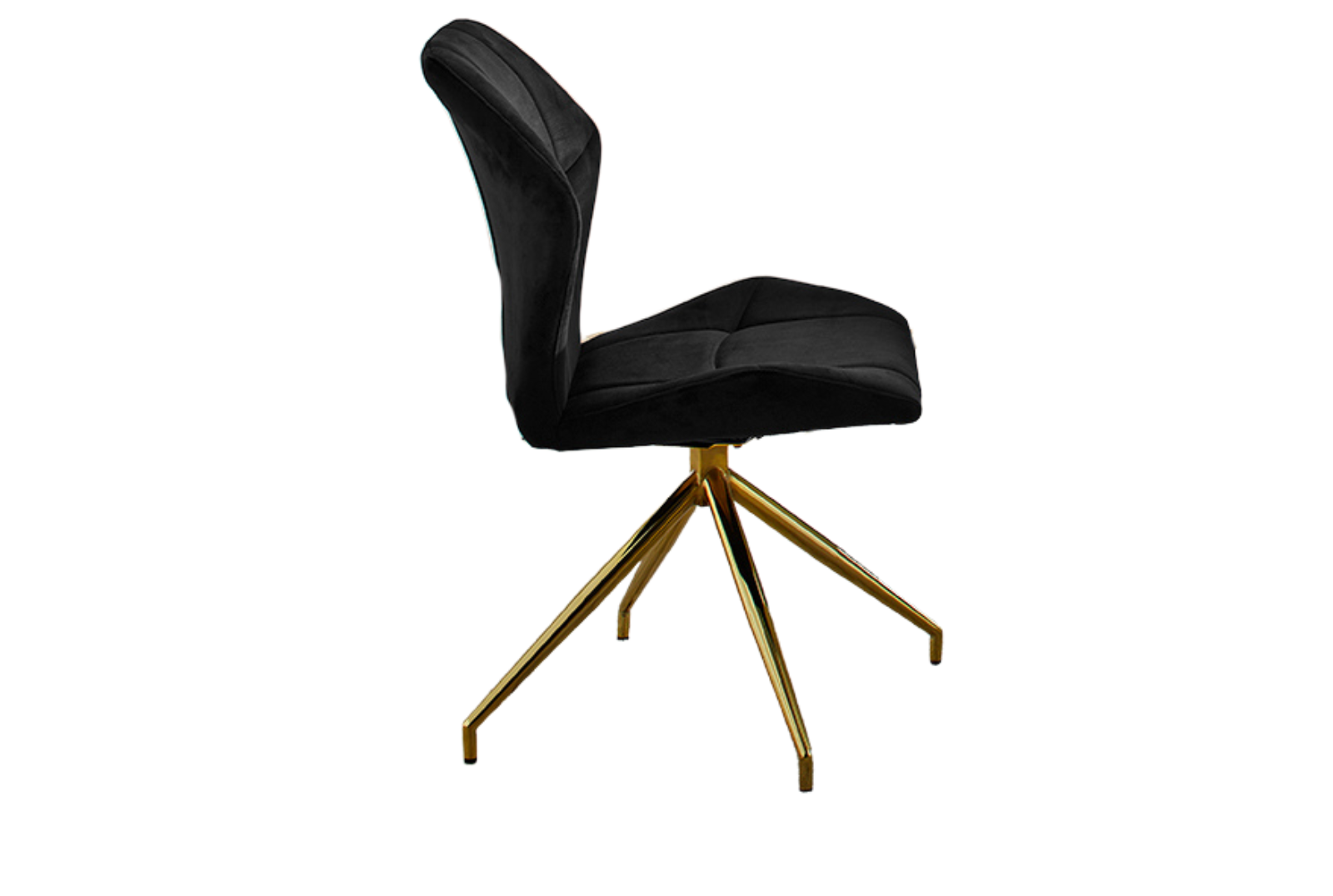 Az Eliana szék igazi statement darab: elegáns, nőies vonalvezetését a fekete kárpit letisztultsága emeli ki, az arany színű, csillagláb pedig éppen annyi luxust ad hozzá, hogy a tér azonnal különlegesebbnek hasson. A magas háttámla kényelmes tartást biztosít, az ülőfelület finom párnázása pedig kellemesen „felveszi” a tested, így nem csak szép, hanem valóban jó is beleülni. Étkezőben exkluzív hotelhangulatot teremt, sminkasztalnál vagy dolgozósarokban pedig olyan fókuszpont lesz, ami minden nap hozzátesz egy kis ünnepélyességet a hétköznapokhoz. Az Eliana akkor a legjobb választás, ha szereted a modern formákat, de nem mondanál le a látványos részletekről.