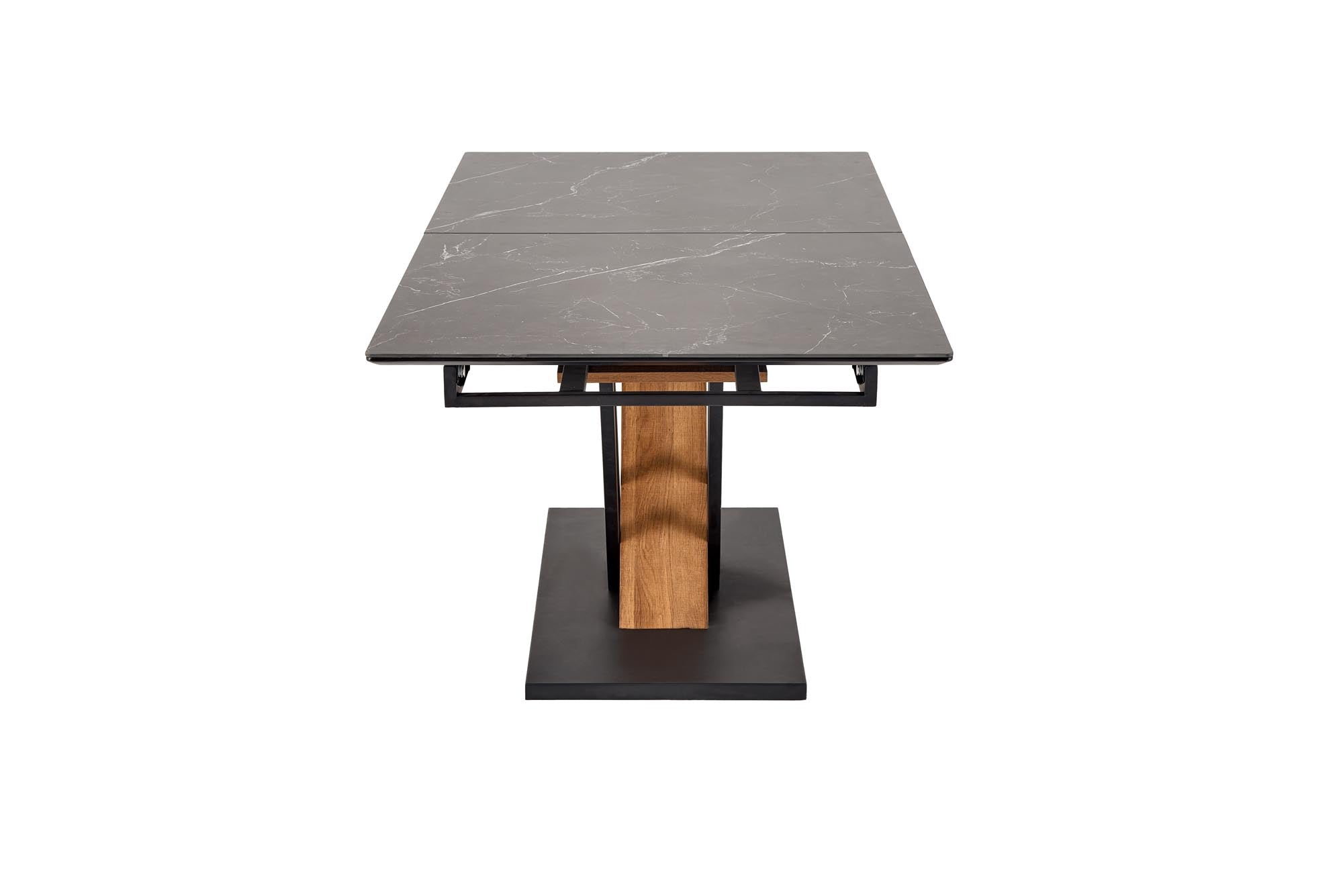 Az Alcuin étkezőasztal a modern esztétika és a prémium anyagok tökéletes kombinációja. A sötét, márványhatású asztallap elegáns és időtálló megjelenést kölcsönöz, míg az aszimmetrikus fa és fém lábszerkezet dinamizmust és egyedi karaktert ad a bútordarabnak. A bővíthető funkció lehetővé teszi az asztal méretének rugalmas változtatását, így ideális választás mindennapi használatra és nagyobb összejövetelekhez is. Az Alcuin tökéletes központi eleme lehet egy modern, ipari vagy luxus enteriőrnek, ahol a különleges formavilág és a kifinomult részletek egyaránt fontosak.