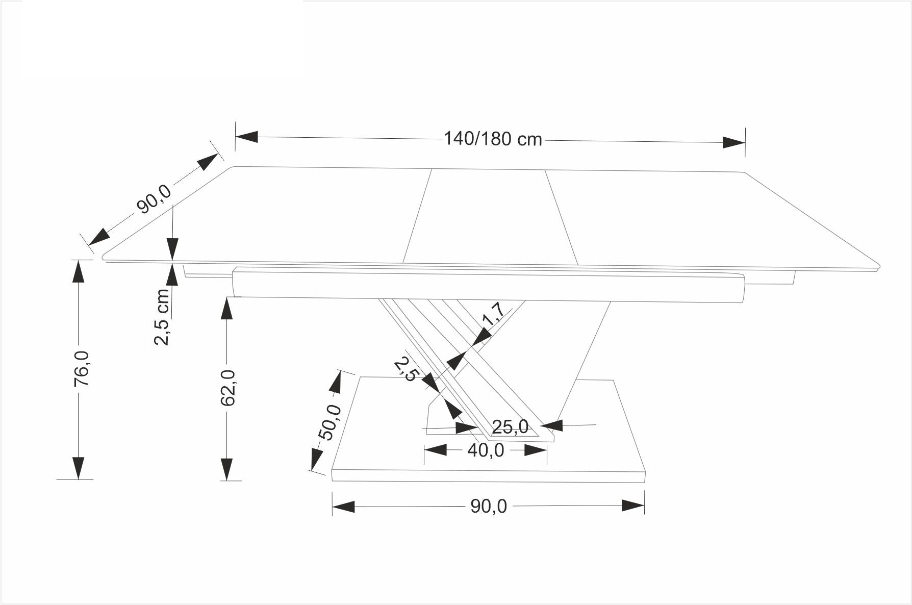 Szélesség 140-180 cm, Magasság 76 cm, Mélység 90 cm