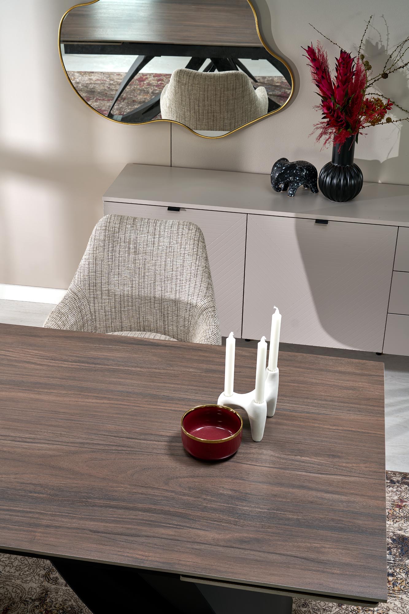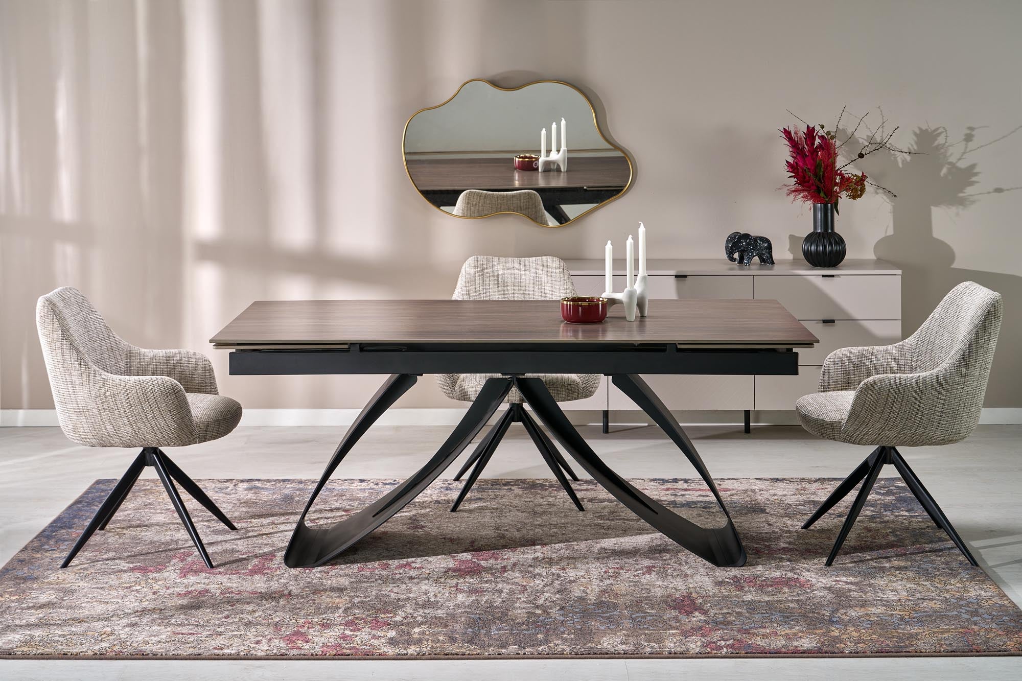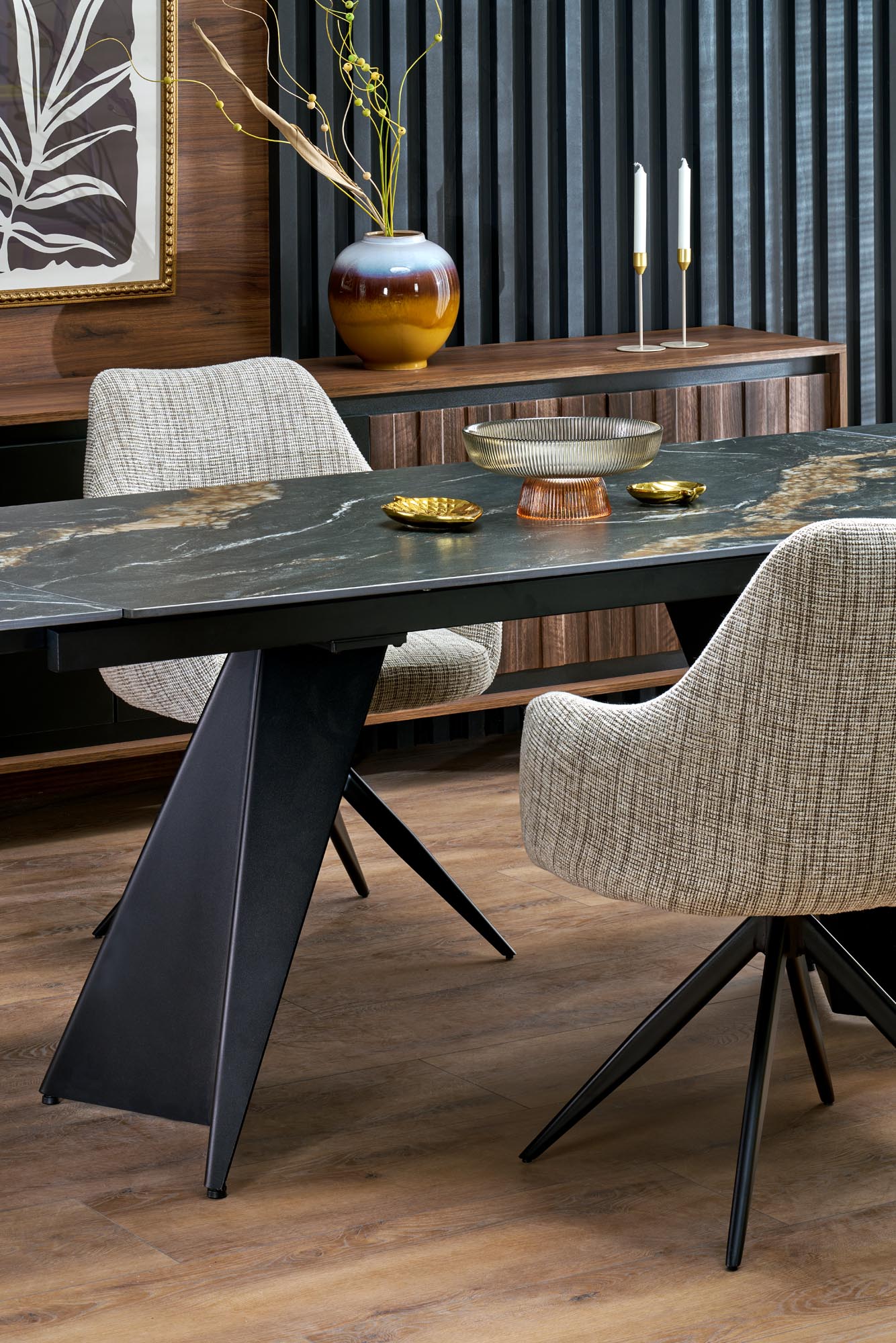 Az Annora étkezőszék tökéletes egyensúlyt teremt a modern megjelenés és a kényelem között. Elegáns steppelt szövetkárpitja prémium minőségű, míg az oldalsó részeken található puha műbőr borítás még kifinomultabbá teszi a dizájnt. A 180°-ban forgatható fém lábazat nemcsak stabilitást, hanem extra funkcionalitást is biztosít, így az Annora szék ideális választás az étkezőbe vagy a dolgozószobába. A szék barna, szürke és zöld színben érhető el, így könnyedén illeszkedik különböző enteriőrökbe, legyen szó klasszikus vagy modern otthonról.